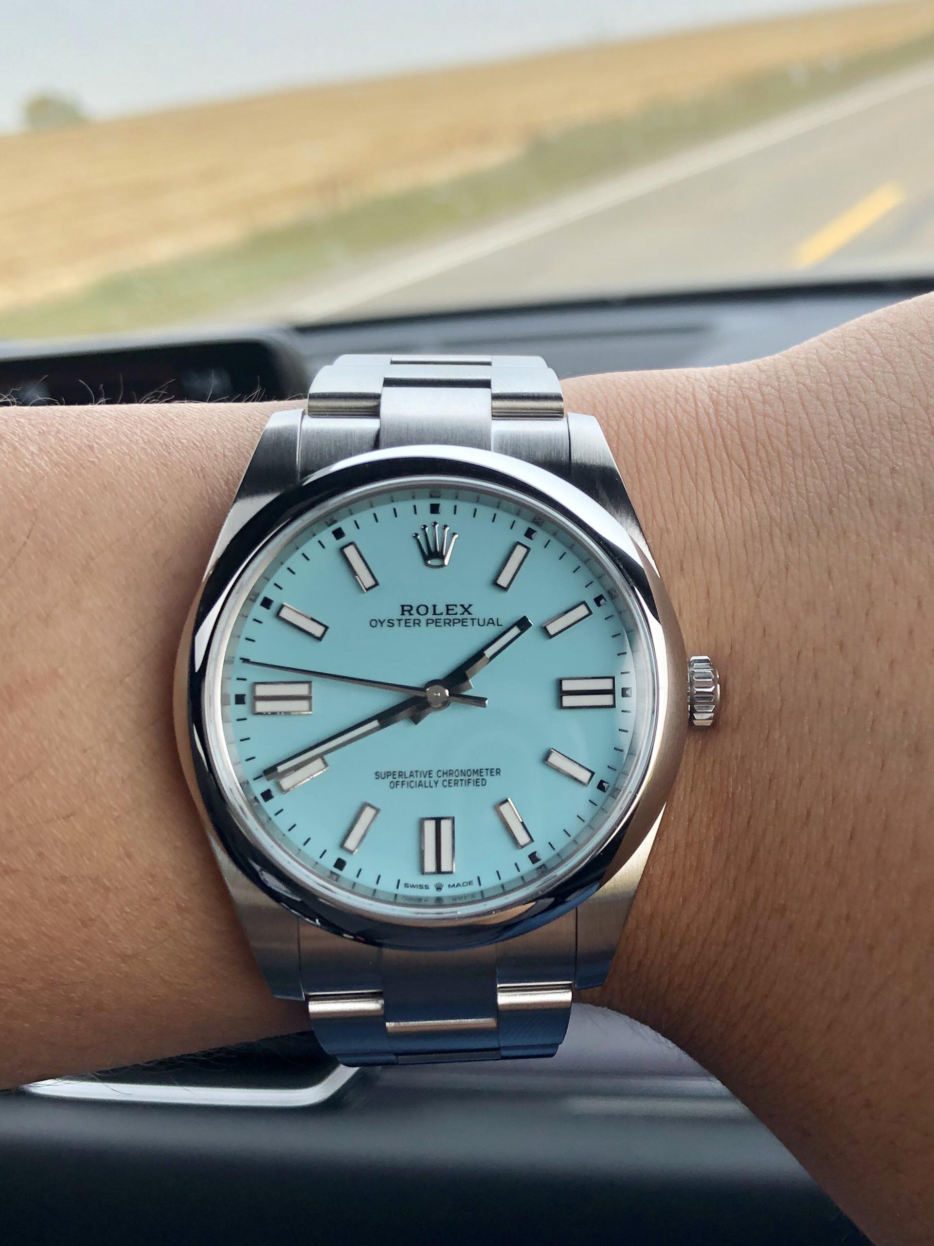 Posted by 1 month ago qc oyster perpetual 41mm tiffany blue ewf from geektime. 41mm oystersteel case and oyster bracelet. It truly looks and feels like the perfect size on my wrist. It truly looks and feels like the perfect size on my wrist.